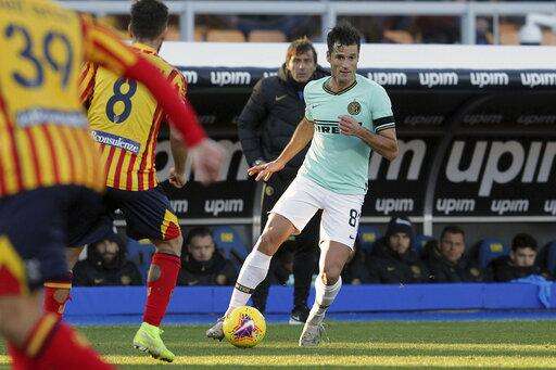 Inter Milan's Antonio Candreva controls the ball during a Serie A soccer match between Lecce and Inter Milan, in Lecce, Italy, Sunday, Jan. 19, 2020. (Donato Fasano/LaPresse via AP) The Associated Press