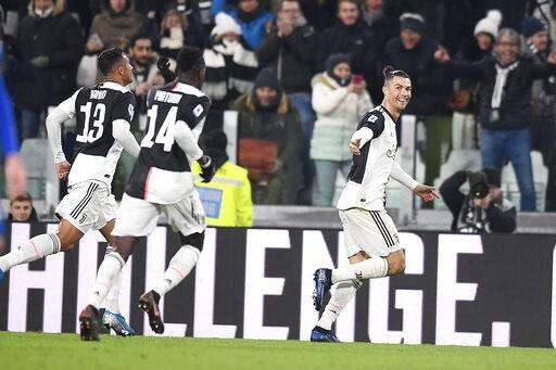 Juventus' Cristiano Ronaldo celebrates after scoring a goal against Parma during an Italian Serie A Soccer match at the Allianz Stadium in Torino, Italy, Sunday, Jan. 19, 2020. (Fabio Ferrari/LaPresse via AP) The Associated Press