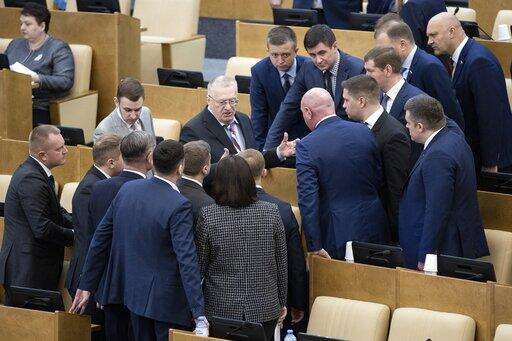 Russian Liberal Democratic Party leader Vladimir Zhirinovsky, center, speaks to other lawmakers prior to a session at the Russian State Duma, the Lower House of the Russian Parliamentin Moscow, Russia, Thursday, Jan. 23, 2020. The Russian lower house of parliament, the State Duma, holds the first of three readings and a vote on a draft bill on constitutional proposals put forward by the Kremlin. The package of constitutional amendments is widely seen as an attempt to secure President Vladimir Putin's grip on power well after his current term ends in 2024. (AP Photo/Alexander Zemlianichenko)