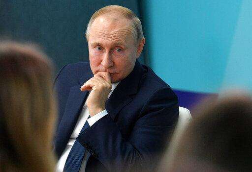 Russian President Vladimir Putin listens for a question as he visits the "Sirius" Educational Centre in the Black Sea resort of Sochi, Russia, Wednesday, Jan. 22, 2020.Putin commented on his proposals to increase state support for families with children made in a state of the nation address last week. (Mikhail Klimentyev, Sputnik, Kremlin Pool Photo via AP)