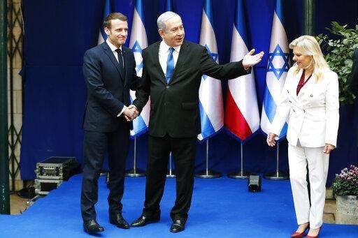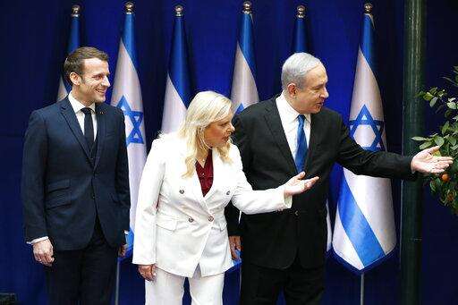 Israeli Prime Minister Benjamin Netanyahu and his wife Sara, right, gesture as they stand next to French President Emmanuel Macron during their meeting in Jerusalem, Wednesday, Jan. 22, 2020. (Ronen Zvulun/Pool Photo via AP)