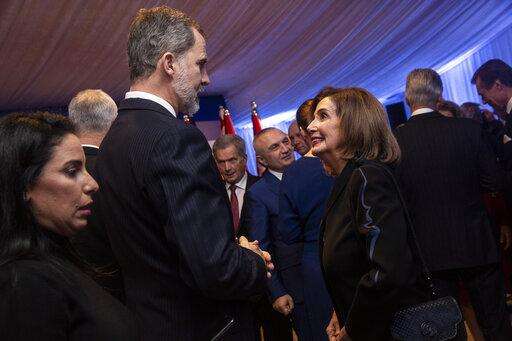Spain's King Felipe VI speaks with U.S. Speaker of the House Nancy Pelosi in Jerusalem on Wednesday, Jan. 22, 2020. Dozens of world leaders have descended upon Jerusalem for the largest-ever gathering focused on commemorating the Holocaust and combating modern-day anti-Semitism. (Heidi Levine/Pool photo via AP)