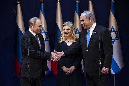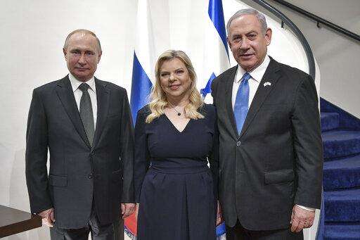 Israeli Prime Minister Benjamin Netanyahu, right, his wife Sara, centre, and Russian President Vladimir Putin pose for the media, in Tel-Aviv, Israel, Thursday, Jan. 23, 2020, ahead of the World Holocaust Forum, which coincides with the 75th anniversary of the liberation of the Auschwitz death camp. Dozens of world leaders have descended upon Jerusalem for the largest-ever gathering focused on commemorating the Holocaust and combating modern-day anti-Semitism. (Aleksey Nikolskyi, Sputnik Kremlin Pool Photo via AP)