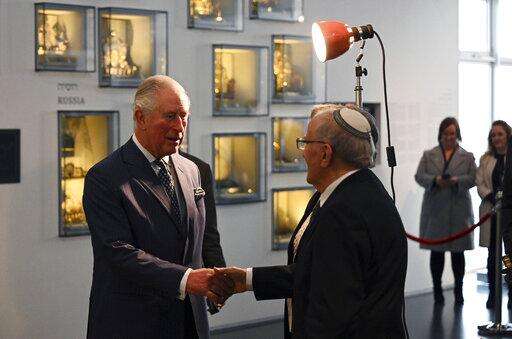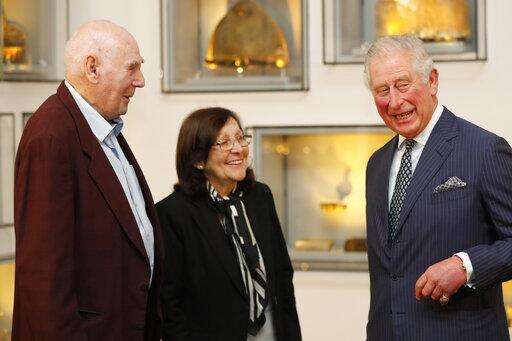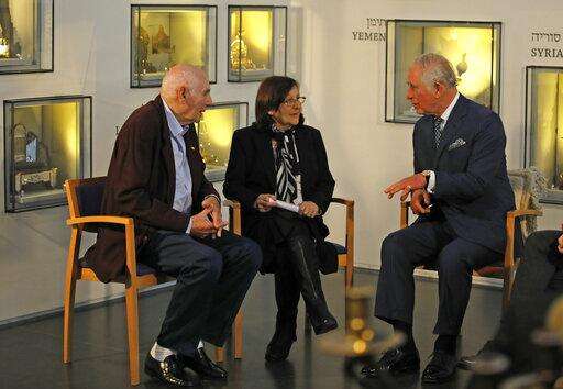 Britain's Prince Charles, right, meets with Holocaust survivors George Shefi and Marta Wise during a reception at the Israel museum in Jerusalem Thursday, Jan. 23, 2020 ahead of the World Holocaust Forum. - Israel hosts dozens of world leaders today to mark 75 years since the liberation of Auschwitz, the World War II death camp where the Nazis killed more than 1.1 million people, most of them Jews.(Menahem Kahana. Pool via AP)