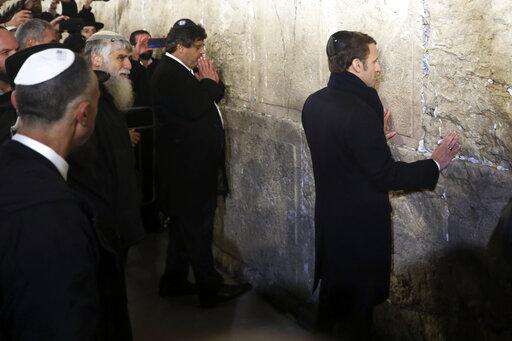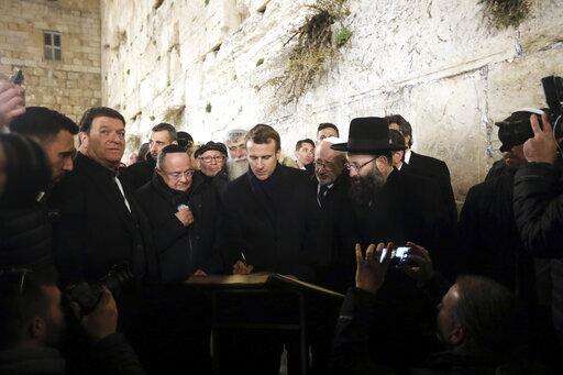 French President Emmanuel Macron, center, visits the Western wall, the holiest site where Jews can pray, in the Old City of Jerusalem, Wednesday, Jan. 22, 2020. Dozens of world leaders have descended upon Jerusalem for the largest-ever gathering focused on commemorating the Holocaust and combating modern-day anti-Semitism. (AP Photo/Mahmoud Illean)