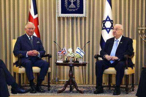 Britain's Prince Charles, center, meets with Israel President Reuven Rivlin, left, and Chief Rabbi Ephraim Mirvis at his official residence in Jerusalem, Thursday Jan. 23, 2020. Prince Charles is among dozens of presidents, heads of state and dignitaries who have descended upon the city to attend the largest-ever gathering focused on commemorating the Holocaust and combating modern-day anti-Semitism (Victoria Jones/Pool via AP)