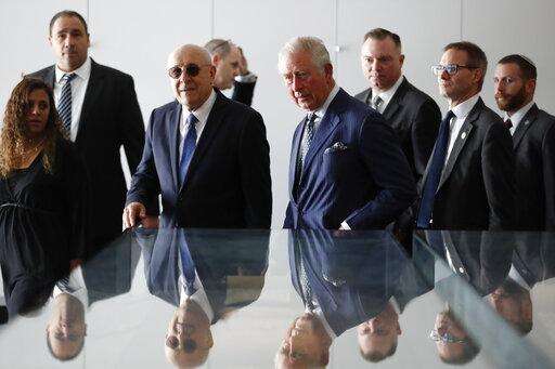 Britain's Prince Charles, left, joins a reception for British Holocaust survivors at the Israel Museum in Jerusalem, Thursday Jan. 23, 2020. Prince Charles is among dozens of presidents, heads of state and dignitaries who have descended upon the city to attend the largest-ever gathering focused on commemorating the Holocaust and combating modern-day anti-Semitism. (Neil Hall/Pool via AP)