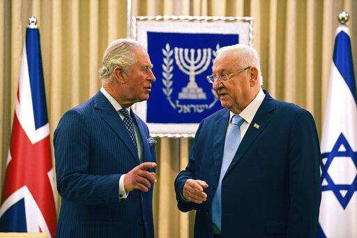 Britain's Prince Charles, left, meets Israel President Reuven Rivlin at his official residence in Jerusalem, Thursday Jan. 23, 2020. Prince Charles is among dozens of presidents, heads of state and dignitaries who have descended upon the city to attend the largest-ever gathering focused on commemorating the Holocaust and combating modern-day anti-Semitism (Victoria Jones/Pool via AP)