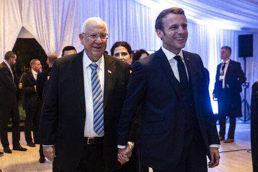 Israeli President Reuven Rivlin walks with French President Emmanuel Macron during a dinner reception in Jerusalem on Wednesday, Jan. 22, 2020. Dozens of world leaders have descended upon Jerusalem for the largest-ever gathering focused on commemorating the Holocaust and combating modern-day anti-Semitism. (Heidi Levine/Pool photo via AP)