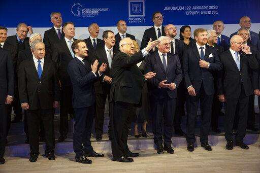World leaders try to organize themselves for a group photograph following a dinner reception as Israel's President Reuven Rivlin, center, thanks his chef at his official residence in Jerusalem on Wednesday, Jan. 22, 2020. Dozens of world leaders descended upon Jerusalem Thursday for the largest-ever gathering focused on commemorating the Holocaust and combating modern-day anti-Semitism. (Heidi Levine/Pool photo via AP)