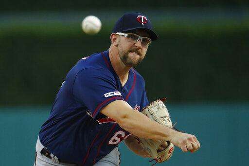FILE - In this Sept. 25, 2019, file photo, Minnesota Twins pitcher Randy Dobnak throws a warmup pitch in the first inning of a baseball game against the Detroit Tigers in Detroit. The Twins remain publicly confident in the rotation anchored by returning veterans Jose Berrios and Jake Odorizzi and supplemented by youngsters like Devin Smeltzer, Dobnak and Lewis Thorpe. (AP Photo/Paul Sancya, File) The Associated Press