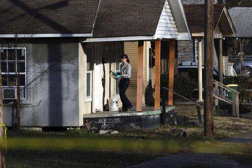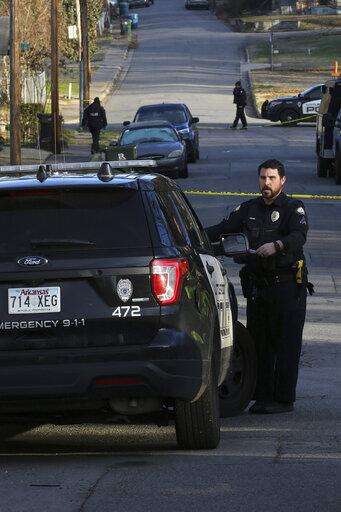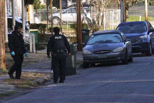 Little Rock Police officers investigate a shooting on Saturday, Jan. 25, 2020, in Little Rock, Ark. Two women were killed and a 2-year-old boy was injured in a shooting at their Little Rock home early Saturday morning, police said. (Thomas Metthe/The Arkansas Democrat-Gazette via AP)
