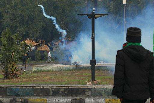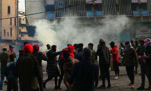 Smoke rise from tear gas fired by security forces during clashes with anti-government protesters in Baghdad, Iraq, Saturday, Jan. 25, 2020. Security forces set fire to anti-government protest tents in the country's south early Saturday and re-opened key public squares in Baghdad that had been occupied by demonstrators for months. (AP Photo/Hadi Mizban) The Associated Press