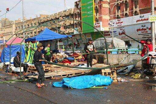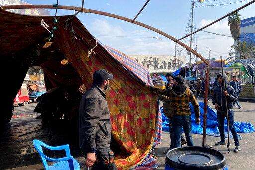 Followers of Shiite cleric Muqtada al-Sadr dismantle their tents in preparation for withdrawing from the anti-government protests in Tahrir Square in Baghdad, Iraq, Saturday, Jan. 25, 2020. Iraq's anti-government protests were dealt a blow after a powerful cleric Shiite withdrew his support from the movement. Shortly after they packed up and left, security forces to set fire to protesters' tents overnight Saturday in the country's south, as well as re-open key public squares in Baghdad that had been occupied by the demonstrators. (AP Photo/Hadi Mizban) The Associated Press