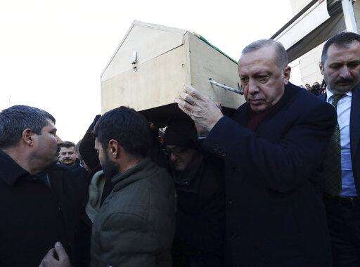 Turkey's President Recep Tayyip Erdogan carries a coffin of a victim after an earthquake hit Elazig, eastern Turkey, Friday, during the funeral procession for Salih Civelek and Aysegul Civelek, Saturday, Jan. 25, 2020. Rescue workers were continuing to search for people buried under the rubble of apartment blocks in Elazig and neighbouring Malatya. Mosques, schools, sports halls and student dormitories were opened for hundreds who left their homes after the quake (Presidential Press Service via AP, Pool)