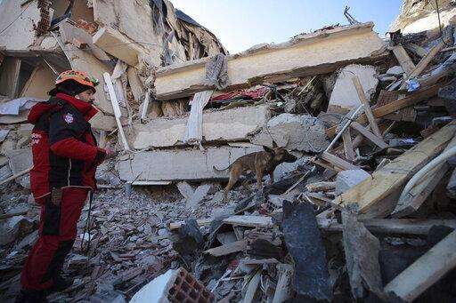 A rescuer with a dog works on searching for people buried under the rubble on a collapsed building, after an earthquake struck Elazig, eastern Turkey, Saturday, Jan. 25, 2020. Rescue workers were continuing to search for people buried under the rubble of apartment blocks in Elazig and neighbouring Malatya. Mosques, schools, sports halls and student dormitories were opened for hundreds who left their homes after the quake (IHH/ Humanitarian Relief Foundation via AP)