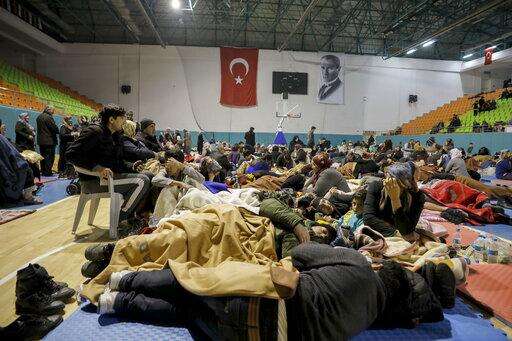People gather inside a sports hall to spend the night following Friday's earthquake that destroyed their houses, in Elazig, eastern Turkey, late Saturday, Jan. 25, 2020. More than 24 hours after a powerful earthquake hit eastern Turkey rescuers continued to pull survivors from under collapsed buildings Sunday. (Ugur Can/DHA via AP)