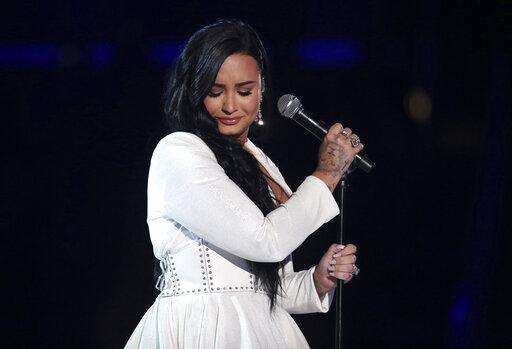 Lovato, in a large white Christian Siriano gown, had to start the performance again after faltering slightly, but finished strongly with just a piano to accompany her. She had the crowd on their feet in a true comeback moment for the 27-year-old singer who has been honest and open about her struggles with addiction.