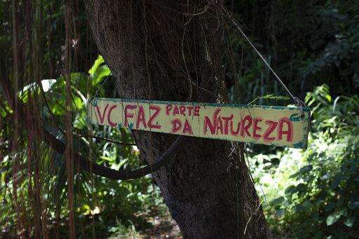 In this Jan. 6, 2020 photo, a sign that reads "You take part of nature" at an area where Ale Roque plants different kinds of trees in Rio's first favela Morro da Providencia, Rio de Janeiro, Brazil. Living in Morro da Providencia, Roque is working to restore some greenery to the urban scene. (AP Photo/Silvia Izquierdo) The Associated Press
