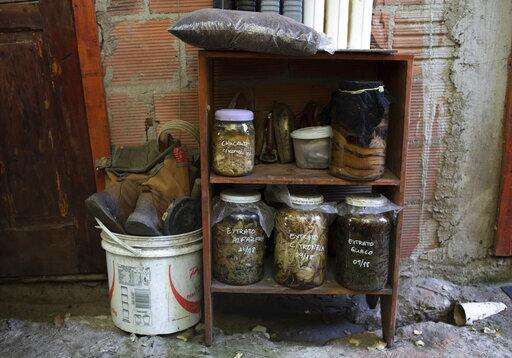 In this Jan. 6, 2020 photo, plants and roots extracts prepared by Ale Roque are stashed at her home in Rio's first favela, Morro da Providencia, Rio de Janeiro, Brazil. Roque plants fruit and vegetable trees in wastelands that had been used as dumping ground in the poor community with produce free for the taking. (AP Photo/Silvia Izquierdo) The Associated Press