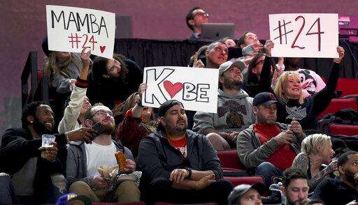 Fans hold up signs in memory of Kobe Bryant, who was killed in a helicopter crash in California, during the second half of an NBA basketball game between the Portland Trail Blazers and the Indiana Pacers in Portland, Ore., Sunday, Jan. 26, 2020. The Blazers won 139-129. (AP Photo/Steve Dykes) The Associated Press