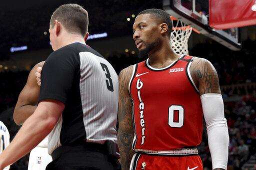 Portland Trail Blazers guard Damian Lillard, right, has some words with referee Nick Buchert, left, during the second half of an NBA basketball game in Portland, Ore., Sunday, Jan. 26, 2020. Lillard scored 50 points as the Blazers won 139-129. (AP Photo/Steve Dykes) The Associated Press