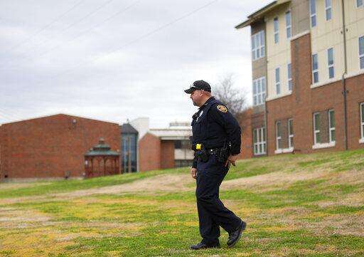 A law enforcement officer patrols the Pride Rock residence hall at Texas A&M-Commerce after a deadly shooting in Commerce, Texas, Monday, Feb. 3, 2020. At least a few women were killed and a child was wounded in the shooting Monday morning at the university dormitory in Texas, officials said. (Don Wallace/The Herald-Banner via AP)