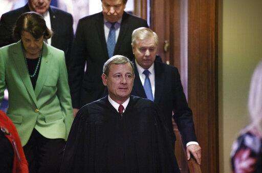Chief Justice of the United States John Roberts, followed by Sen. Dianne Feinstein, D-Calif., left, and Senate Judiciary Committee Chairman Lindsey Graham, R-S.C., leaves the Senate chamber after presiding over the impeachment trial and today's acquittal of President Donald Trump, at the Capitol in Washington, Wednesday, Feb. 5, 2020. (AP Photo/J. Scott Applewhite) The Associated Press