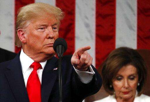 President Donald Trump delivers his State of the Union address to a joint session of Congress in the House Chamber on Capitol Hill in Washington, Tuesday, Feb. 4, 2020, as Nancy Pelosi listens. (Leah Millis/Pool via AP) The Associated Press