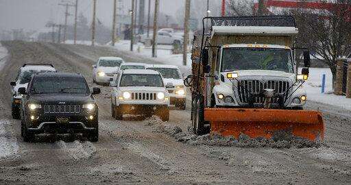 A truck plows snow, ice and slush from 11th Street at Harvard Ave. in Tulsa, Okla., Wednesday, Feb. 5, 2020. (Mike Simons/Tulsa World via AP)