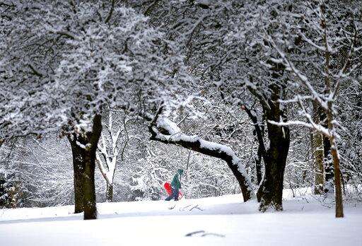 Denise Hendricks walks up a snow covered hill while sledding at Hafer Park following a winter storm in Edmond, Okla., Wednesday, Feb. 5, 2020. (Sarah Phipps/The Oklahoman via AP)