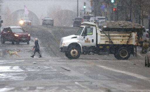 A pedestrian and a sand truck cross Boston Ave. at Sixth street in Tulsa, Okla., on Wednesday, Feb. 5, 2020. A winter storm blanketed the region in snow with forecasters expecting a total of up to 5 inches to fall throughout the Tulsa region. (John Clanton/Tulsa World/Tulsa World via AP)