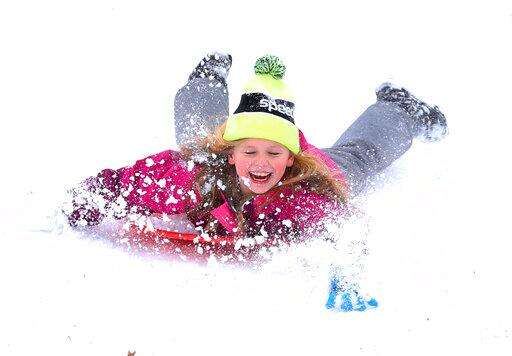 Alice Newhouse, 8, sleds down the snow covered hill next to Will Rogers High School in Tulsa on Wednesday, Feb. 5, 2020 after school was cancelled Wednesday due to a winter storm. . (Tom Gilbert/Tulsa World/Tulsa World via AP)
