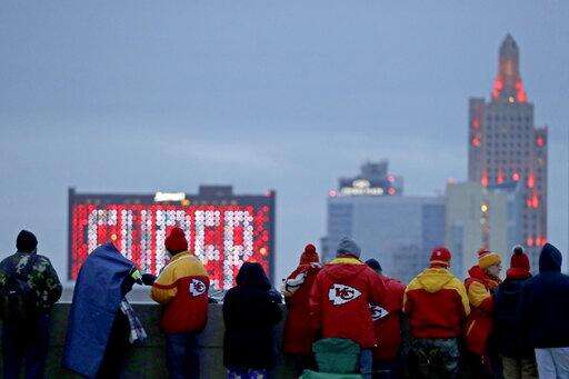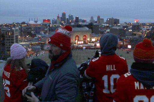 People gather at the Liberty Memorial as they wait for a parade through downtown Kansas City, Mo. to celebrate the Kansas City Chiefs victory in NFL's Super Bowl 54 Wednesday, Feb. 5, 2020. (AP Photo/Charlie Riedel)
