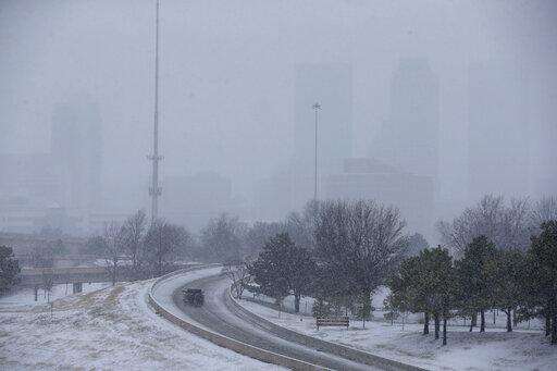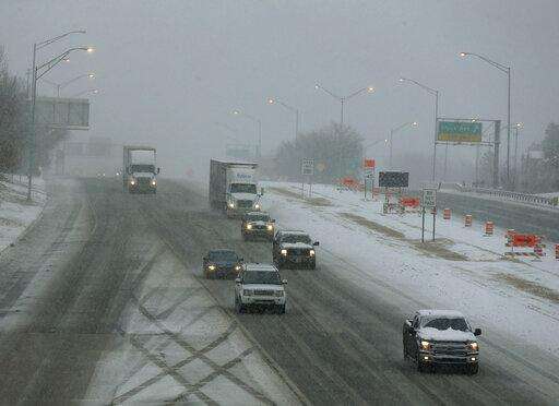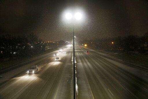Commuters travel in snow and a wintry mix on I-244 Wednesday, Feb. 5, 2020 in Tulsa, Okla. A powerful winter storm dropped snow throughout parts of Texas and Oklahoma early Wednesday. (Mike Simons/Tulsa World via AP)