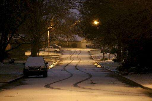 Snow covers the road in south Tulsa, Oka., on Wednesday, Feb. 5, 2020. A powerful winter storm dropped snow throughout parts of Texas and Oklahoma early Wednesday. (John Clanton/Tulsa World via AP)