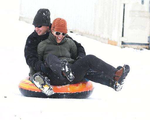 Chris Clendenin and Nancy Curry sled down the snow covered hill next to Will Rogers High School in Tulsa on Wednesday, Feb. 5, 2020. (Tom Gilbert/Tulsa World/Tulsa World via AP)