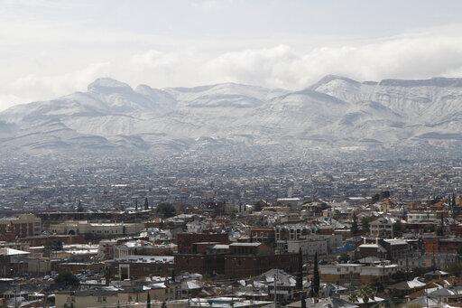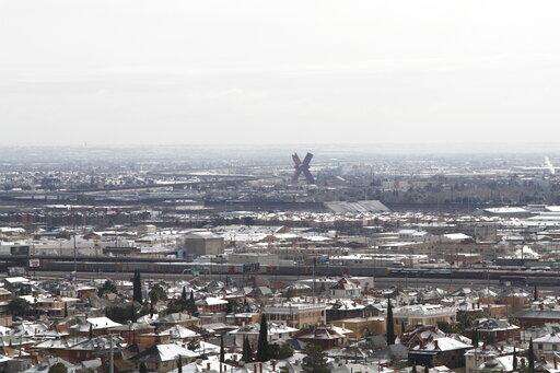 Snow covers rooftops on either side of the U.S.-Mexico border as seen on Wednesday, Feb. 5, 2020, from El Paso, Texas. A few inches of snow led to slow starts at schools in El Paso and caused hour-long delays on local roads. The fence marking the border can be seen in the upper half of the photo. The red "X"-shaped building is in Ciudad Juarez, Mexico. (AP Photo/Cedar Attanasio)