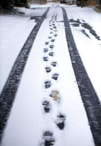 Tracks are pictured in the snow on the trails at Mitch Park following a winter storm in Edmond, Okla., Wednesday, Feb. 5, 2020. (Sarah Phipps/The Oklahoman via AP)
