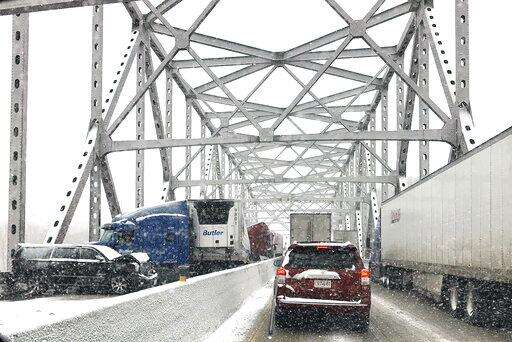 Snowfall was heavier to the east, where several tractor-trailers and passenger vehicles collided around noon on a bridge that spans the Missouri River near Rocheport, shutting down westbound traffic on the interstate. Missouri State Highway Patrol Sgt. Scott White said at least one person was taken from the scene in an ambulance.