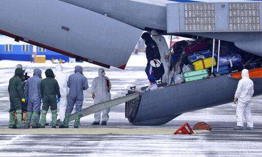 A group of medical personnel meet 80 people, accompanied by medical specialists, carried by a Russian military plane at an airport outside Tyumen, Russia, Wednesday, Feb. 5, 2020. Russia has evacuated 144 people - Russians and nationals of Belarus, Ukraine and Armenia - from the epicenter of the coronavirus outbreak in Wuhan, China, on Wednesday. All evacuees will be quarantined for two weeks in a sanatorium in the Tyumen region in western Siberia, government officials said. (AP Photo/Maxim Slutsky) The Associated Press