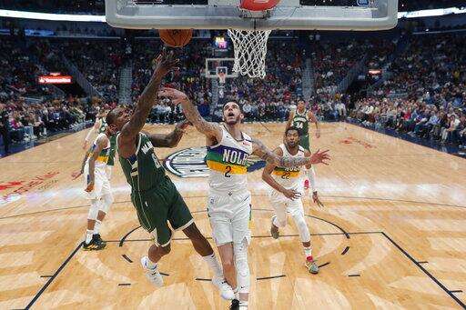 On offense, Antetokounmpo's physical dominance was on full display when he transferred the ball from his left to right hand and flipped it in off the glass as Pelicans guard Jrue Holiday pulled forcefully on his left arm in an attempt to stop him from scoring by fouling.