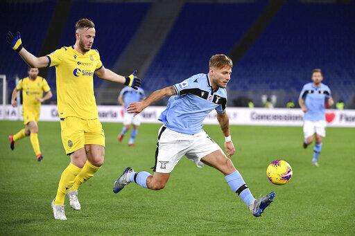 Lazio's Ciro Immobile, right, in action during the Italian Serie A soccer match between Lazio and Hellas Verona at the Stadio Olimpico in Rome, Wednesday, Feb. 5, 2020. (Alfredo Falcone/LaPresse via AP)