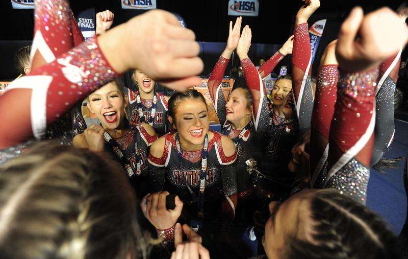 Antioch High School (medium team) cheerleaders compete in state finals and take first place in Bloomington on Saturday.