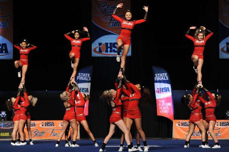 Stevenson High School (large team) cheerleaders compete in state finals in Bloomington on Saturday.