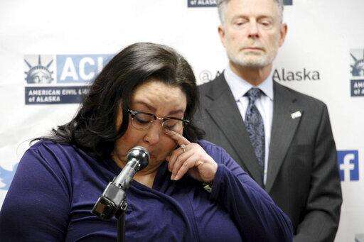 Clarice Hardy wipes a tear away from her eye during a news conference Thursday, Feb. 20, 2020, in Anchorage, Alaska. The American Civil Liberties Union of Alaska filed a lawsuit Thursday on Hardy's behalf against the City of Nome, Alaska, and two former officers for failing to investigate the sexual assault report filed by Hardy, a former police dispatcher. On the right is Stephen Koteff, the ACLU's legal director in Alaska. (AP Photo/Mark Thiessen) The Associated Press