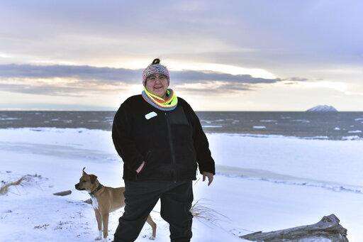 FILE - In this Jan. 14, 2019, file photo, Clarice "Bun" Hardy stands on the beach with her dog, Marley, in the Native Village of Shaktoolik, Alaska. The American Civil Liberties Union has scheduled a Thursday, Feb. 20, 2020, news conference to update its demand from the city of Nome to award $500,000 to Hardy. She is a former dispatcher for the Nome Police Department, and claims she couldn't get her own colleagues to investigate her report that she was sexually abused. The ACLU's action was filed after an Associated Press investigation of complaints by Alaska Native women that their reports of sexual assault were not investigated aggressively by Nome police. (AP Photo/Victoria Mckenzie, File) The Associated Press