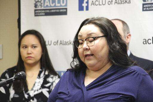 Clarice Hardy speaks at a news conference Thursday, Feb. 20, 2020, in Anchorage, Alaska. The American Civil Liberties Union of Alaska filed a lawsuit Thursday on Hardy's behalf against the City of Nome, Alaska, and two former officers for failing to investigate the sexual assault report filed by Hardy, a former police dispatcher. On the left is Kendri Cesar, an attorney with a Juneau law firm that is assisting with the case. (AP Photo/Mark Thiessen) The Associated Press
