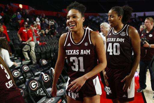Texas A&M forward N'Dea Jones (31) and center Ciera Johnson (40) celebrate after getting a win in an NCAA college basketball game against Georgia in Athens, Ga., Thursday, Feb. 20, 2020. (Joshua L. Jones/Athens Banner-Herald via AP)