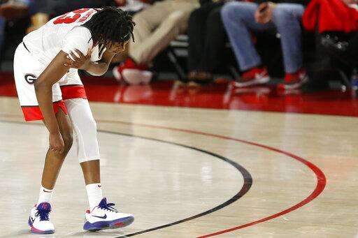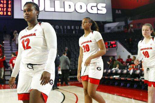 Georgia guard Kaila Hubbard (12), forward Jordan Isaacs (20) and guard Caitlin Hose (10) react after losing an NCAA college basketball game against Texas A&M in Athens, Ga., Thursday, Feb. 20, 2020. (Joshua L. Jones/Athens Banner-Herald via AP)